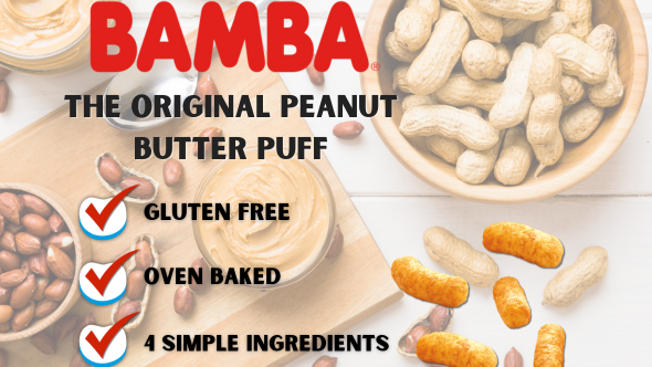 The original peanut butter puff (1964). Bamba Peanut Butter Puffs are made with 4 simple ingredients. There are no artificial colors, flavors or preservatives and no added sugars. They are NON-GMO, Gluten free, Oven baked, Vegan and the perfect snack for the entire family to enjoy. The 2.5 Oz. Bag is great if you’re on the go!